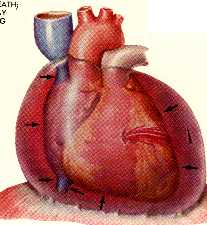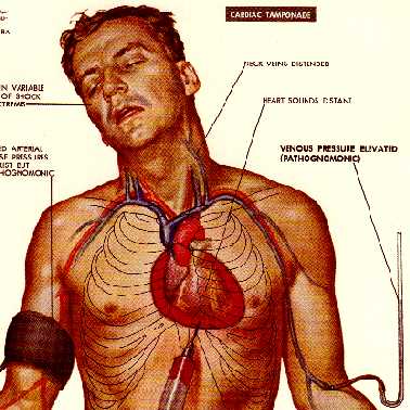FISIOPATOLOGIA Una vez lesionado el coraz�n se produce una hemorragia que r�pidamente se acumula en el saco peric�rdico.Obs�rvese la estrangulaci�n producida en la cava superior (asi como en la inferior) como consecuencia de la distensi�n peric�rdica. Ello supone una dificultad en el retorno venoso y por consiguiente una disminuci�n del d�bito cardiaco. Por otra parte al estar el coraz�n oprimido por la sangre vertida en el pericardio no puede realizar con facilidad la relajaci�n diast�lica lo que agrava a�n m�s el retorno venoso. |
