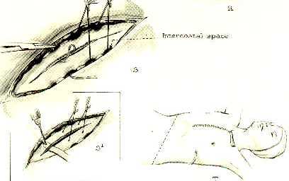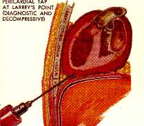 Se realiz� una pericardiocentesis obteni�ndose un l�quido amarillo seroso.Esta pericardiocentesis debe ser realizada de urgencias incluso por una Enfermera especializada en atenciones de emergencias al objeto de evacuar la sangre acumula en el pericardio y evitar el paro cardiaco. Al intentar colocar un drenaje "pig tail" un Facultativo de la UCI, la aspiraci�n peric�rdica se volvi� hemorr�gica. La presi�n venosa se elev� mientras que la presi�n arterial descendi�. El paciente present� irregularides del ritmo cardiaco y sufri� un paro cardiaco del que se recobr� tras las correspondientes maniobras de reanimaci�n cardio-circulatorias. La radiografia anteroposterior del t�rax mostr� un gran derrame peric�rdico.