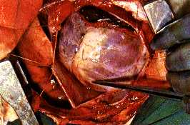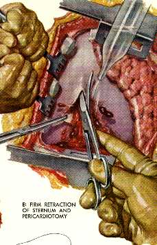 TRATAMIENTO QUIR�RGICO :ABORDAJE TOR�CICO III Se abre el pericardio y se evacua la sangre y co�gulos de su interior que dificultaban la relajaci�n diast�lica y el retorno venoso. |