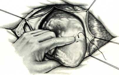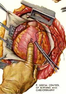TRATAMIENTO QUIR�RGICO :ABORDAJE TOR�CICO III Se cohibe la hemorragia colocando un dedo sobre la perforaci�n ventricular mientras se sutura la lesi�n cardiaca. |